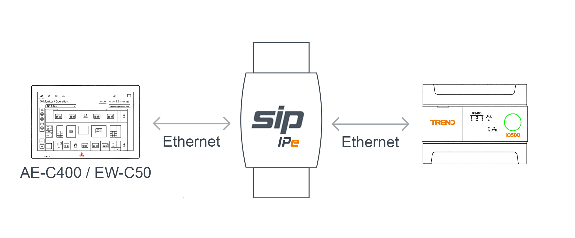 The SIP IPe Melco Proxy has been developed to provide a communications link between Trend IQ controllers (IQ5, IQ4, etc.) and Mitsubishi AE-C400/EW-C50 controllers.